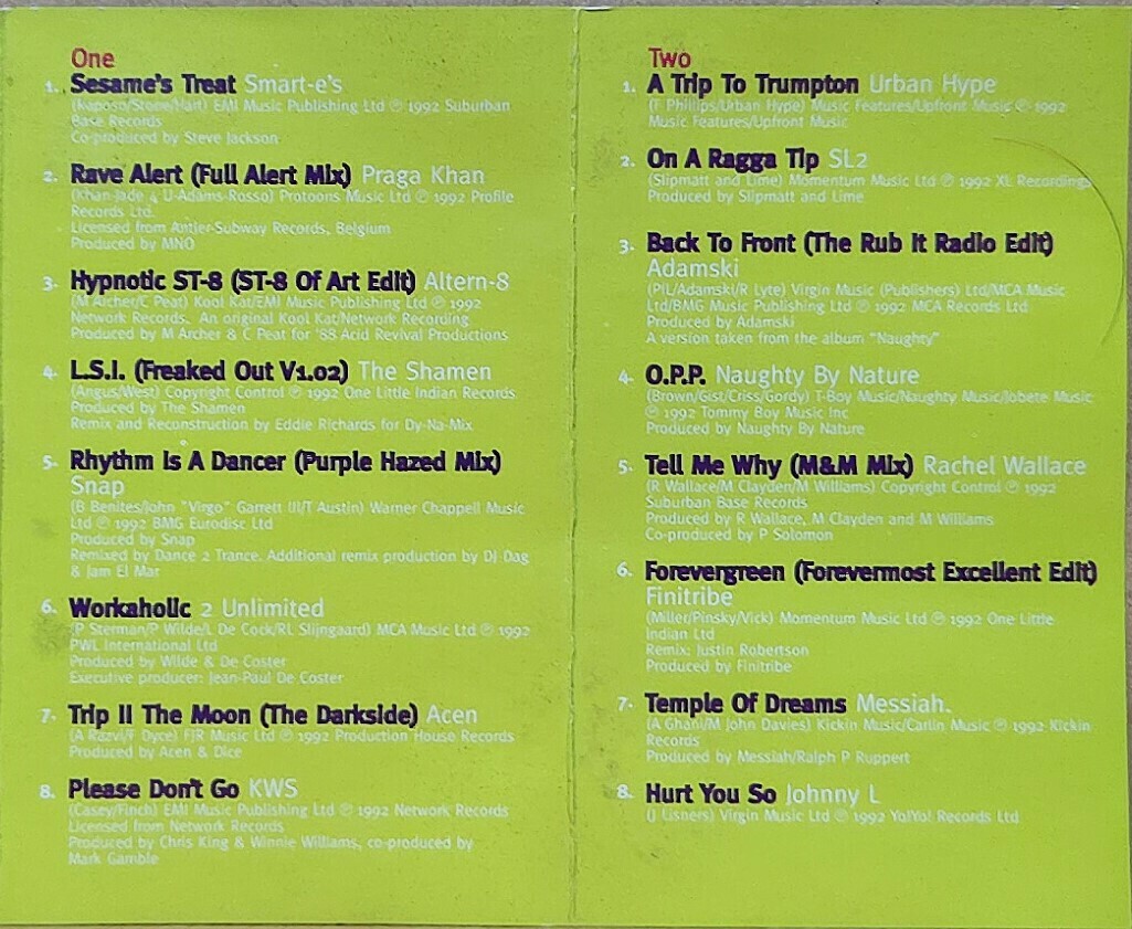 SMART E'S - Sesame's Treat / PRAGA KHAN - Rave Alert (Full Alert Mix) / ALTERN-8 - Hypnotic ST-8 (ST-8 Of Art Edit) / THE SHAMEN - L.S.I. (Freaked Out V1.02) / SNAP - Rhythm Is A Dancer (Purple Hazed Mix) / 2 UNLIMITED - Workaholic / ACEN - Trip To The Moon (The Darkside) / KWS - Please Don't Go