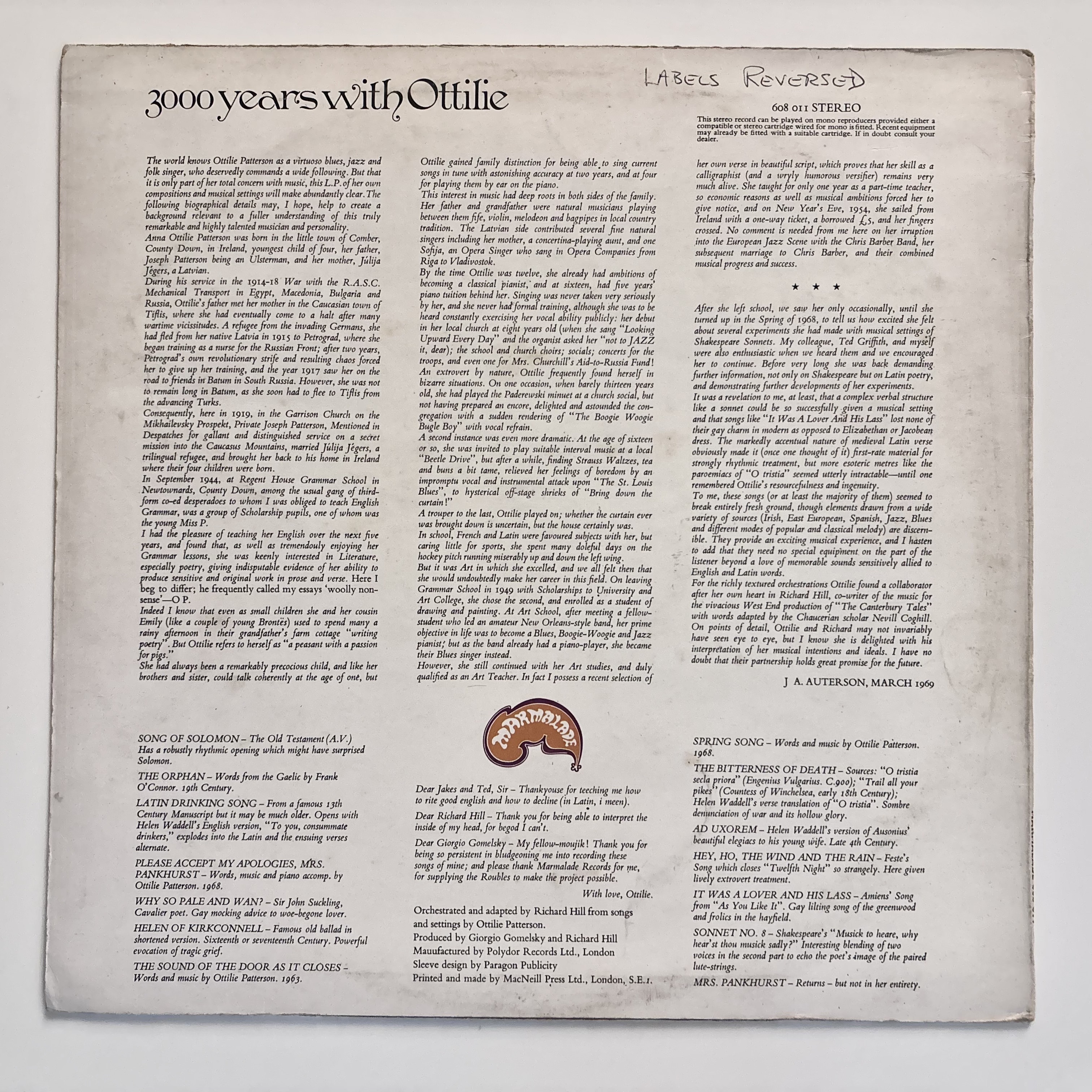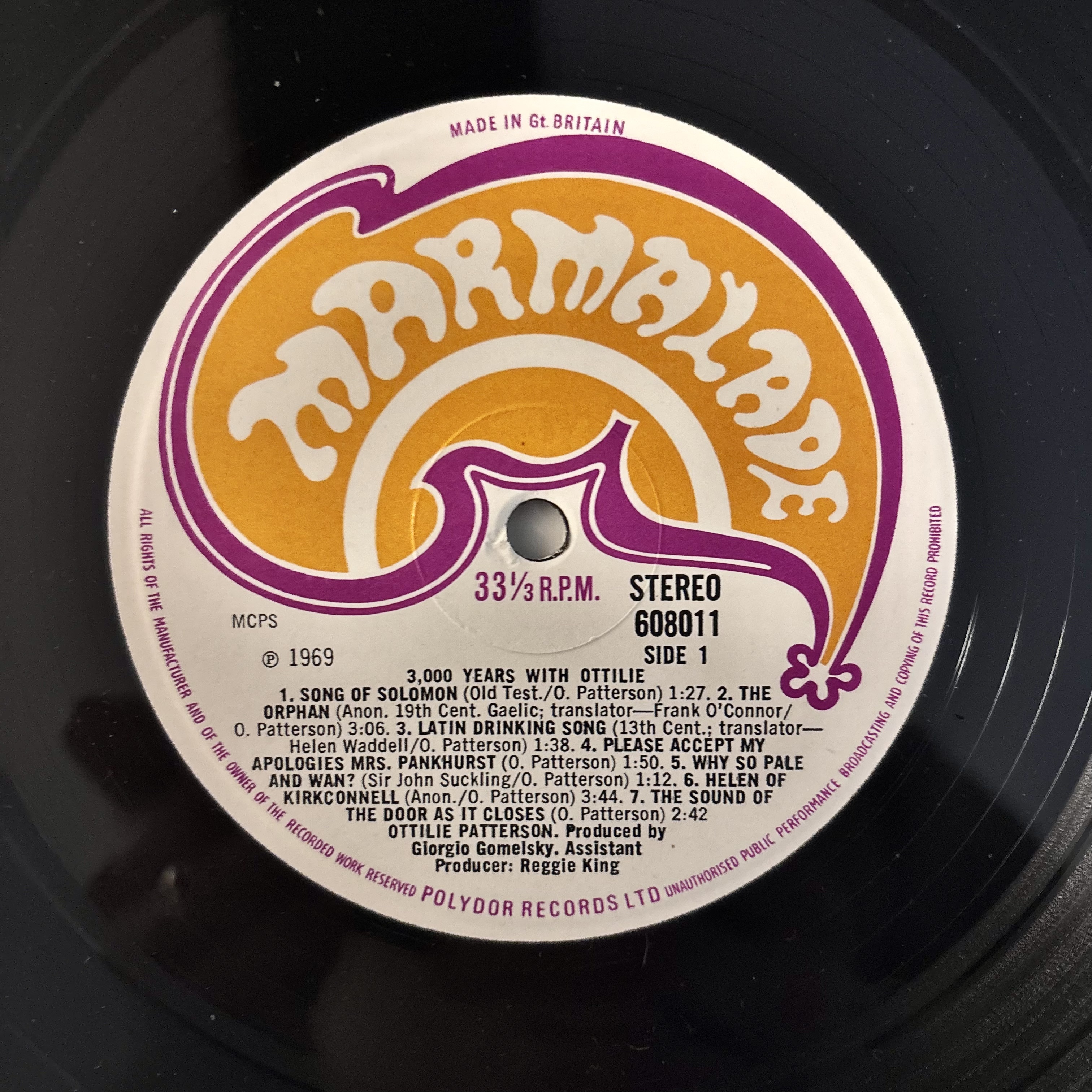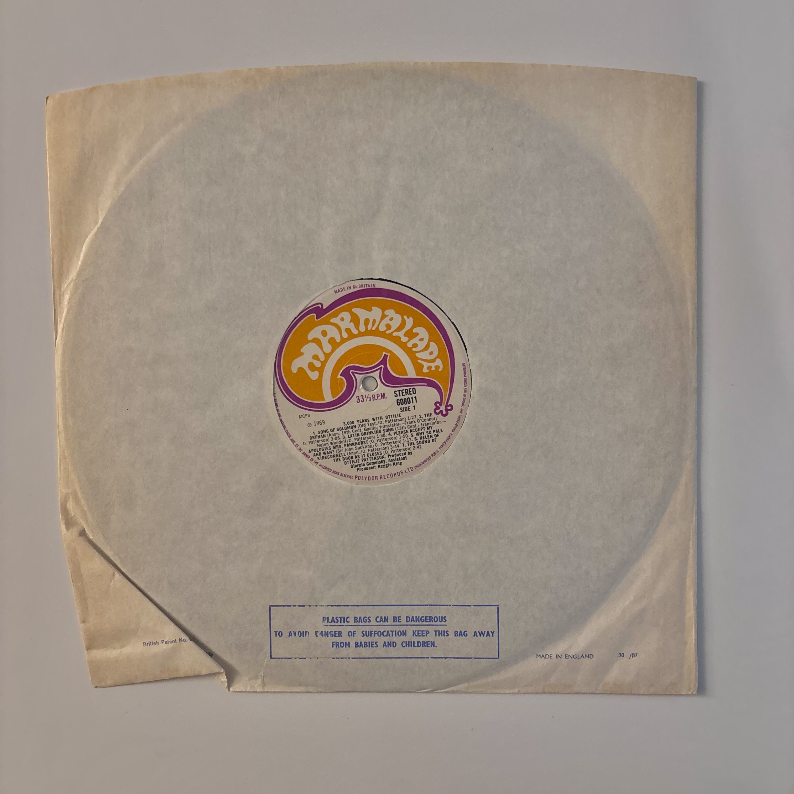 The sleeve has light general wear. The disc is bright and glossy, with a few very small marks that don't affect the sound. As someone has written on the back, the labels have been reversed.